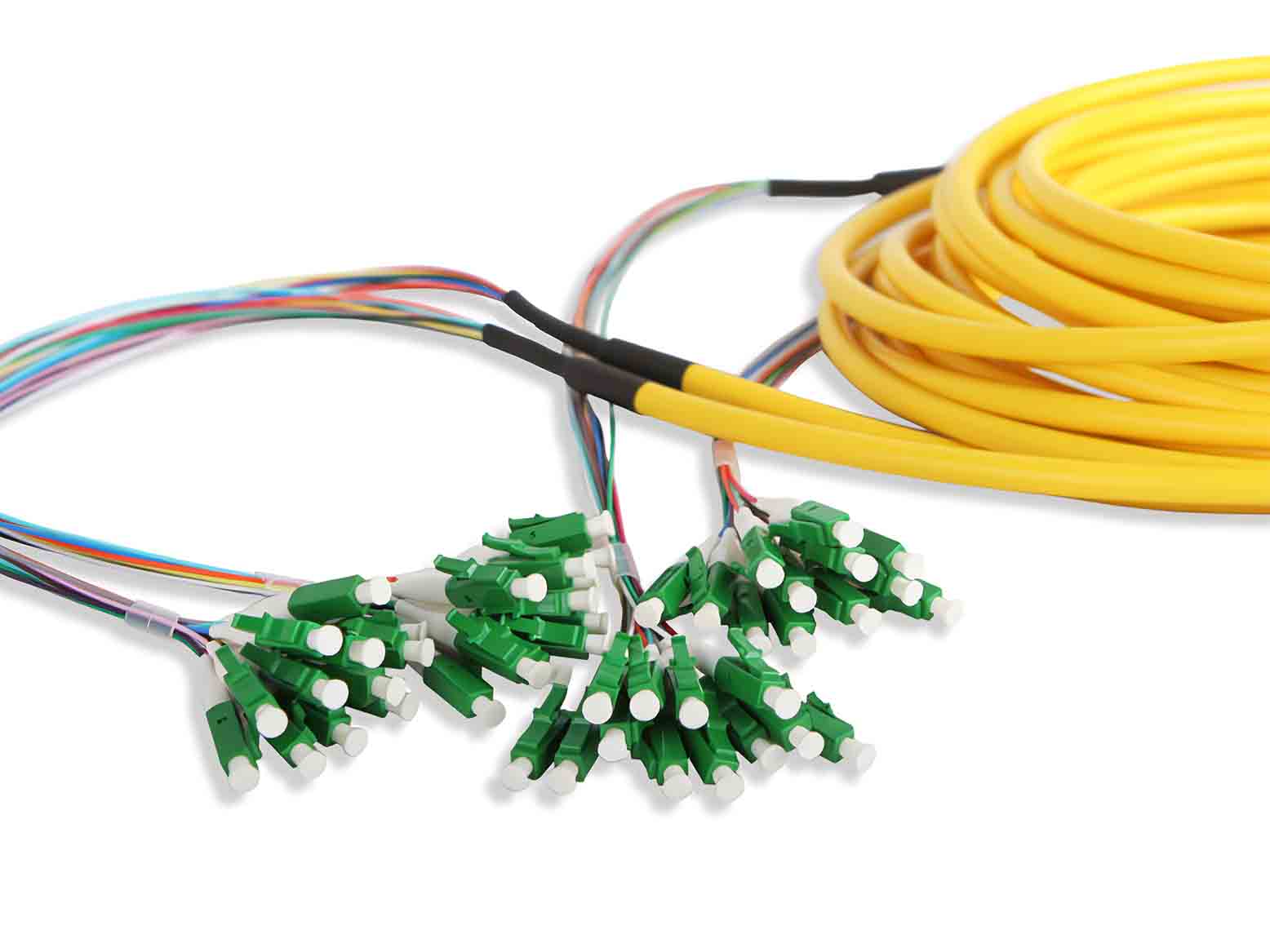 Provides breakout fiber optical cable fanouts. The cable fanouts is make by a small, compact size of micro fiber cable.The cable fanout assembly can be 4 to 144 cores with different terminations, such as LC, SC, FC, ST and MU etc.The standard diameter of the tails part can be 0.9mm or 2.0mm. 2.0mm fanout tail parts are ruggedized to secure the optical fiber in the non-protected environment outside of the patch panel or optical distribution frame(ODF). The breakout fiber optical fanout cables are commonly used in FTTC, FTTB, FTTH, FTTA, data center, industrial, robotic, health-care fields, etc.in a quick, simple and cost effective operation.